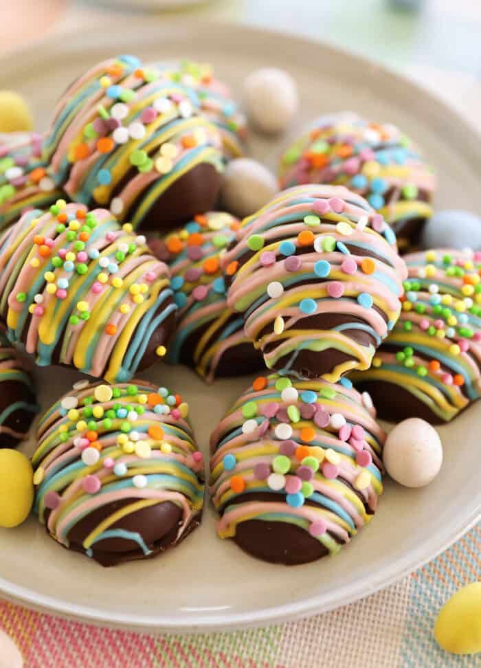 Decorate and chill. This is optional, but you can also drizzle the eggs with colored chocolate and top with fun sprinkles. Or just leave them as is (like Reese’s eggs) and store them in the freezer until ready to enjoy.