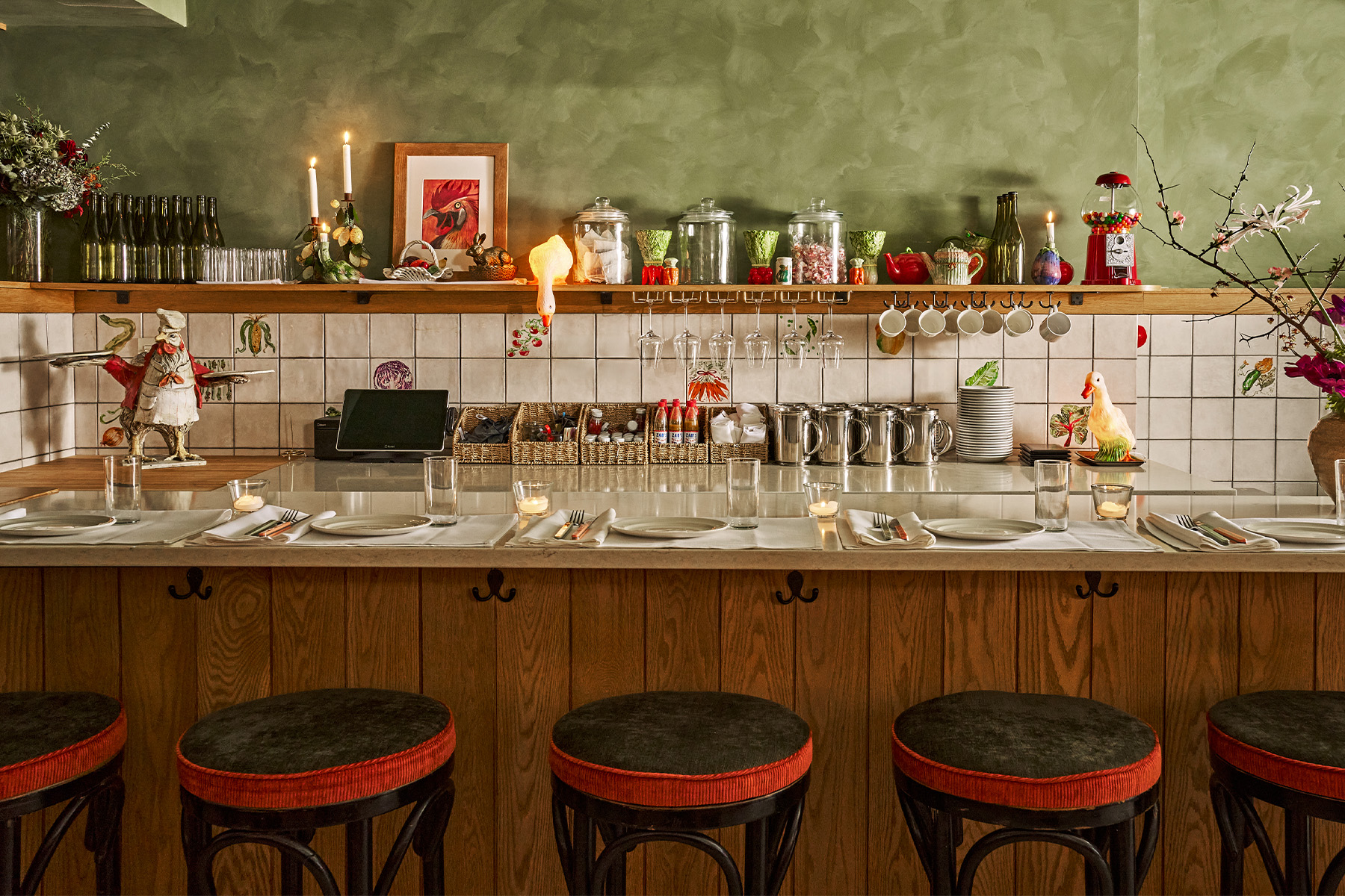 In Nashville, Tennessee, Ophelia’s Pizza Bar, which opened in 2023, is practically wallpapered with tchotchkes and framed pictures; April Bloomfield (of Spotted Pig and Breslin fame) just opened a bar called the Victorian in Austin, Texas, with paisley fabric chairs and antique chests; while in Portland, Maine, recently opened Luncheonette delivers cheery strokes of Kelly green paint, vintage-looking honeycomb floor tiles, and the sensation that, at any moment, a Madame Alexander doll will be plating your celery root remoulade.