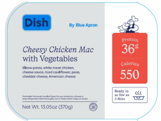 Sold by Blue Apron: 13.05-oz. plastic tray packages labeled “DISH by Blue Apron Cheesy Chicken Mac with Vegetables” with lot codes 25240 and 25247. The product bears establishment number “P-3081.”